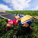 Girl and boy relaxing on green meadow