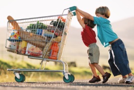 two young children pushing a shopping cart with groceries